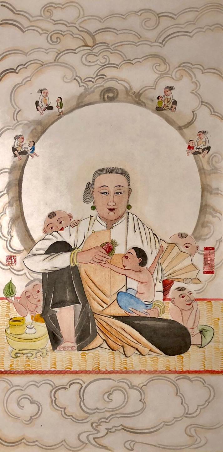 - Hiện cõi Người thì mẹ từ bi, ôm thương, ấp ủ đứa con thơ.